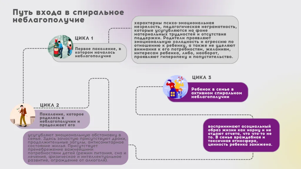 Спиральное неблагополучие — это передача из поколения в поколение негативных закономерностей функционирования семьи. В рамках исследования были выявлены риск-факторы и триггеры, влияющие на возникновение этого явления, признаки, по которым специалисты могут определить, что семья, вероятно, заходит в спиральное неблагополучие, а также разработаны практические рекомендации специалистам о том, что нужно делать, чтобы помочь семье выйти из негативного сценария.